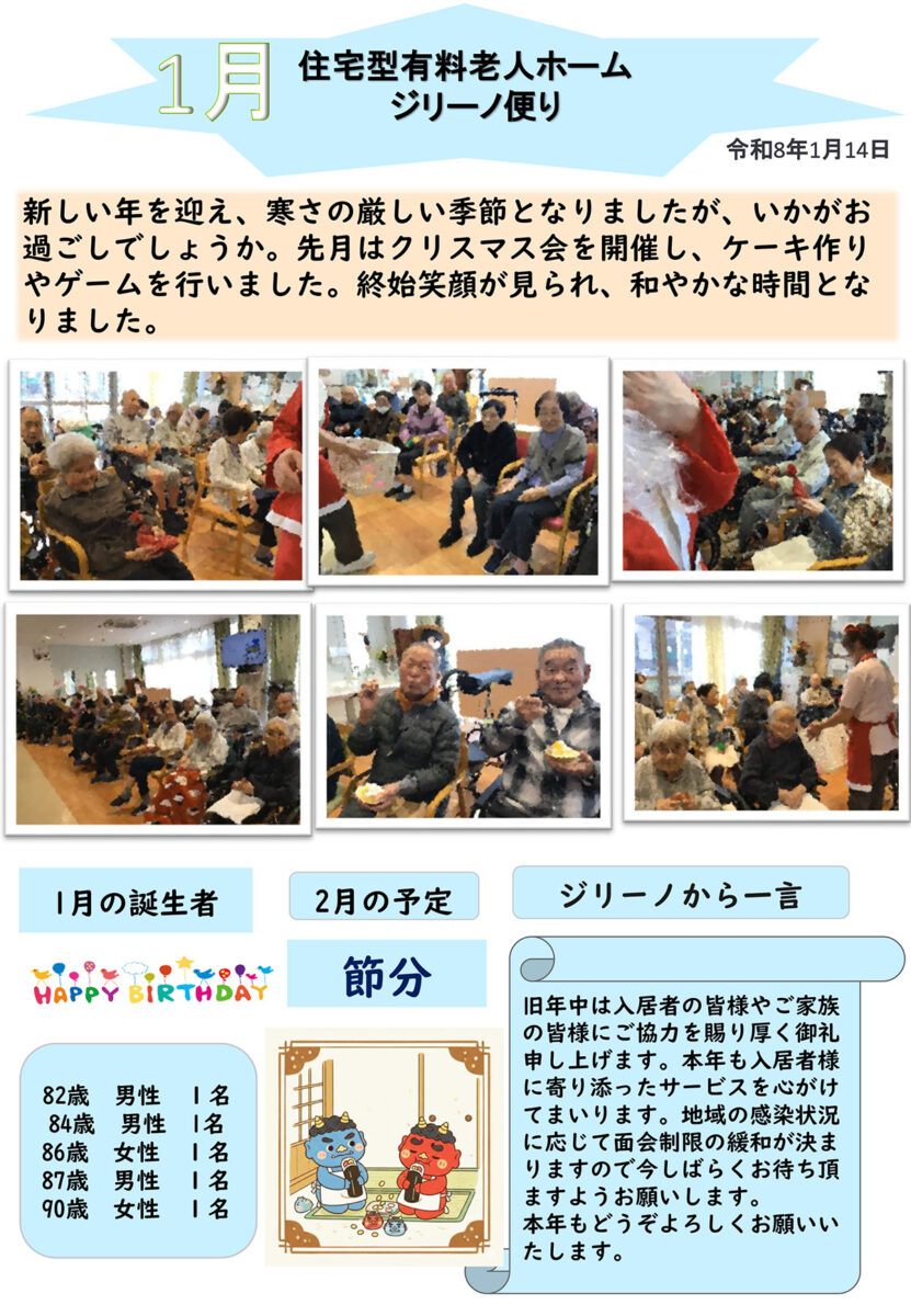 住宅型有料老人ホーム ジリーノ便り2026年1月 2026年01月22日 共有:クリックして Twitter で共有 (新しいウィンドウで開きます)Facebook で共有するにはクリックしてください (新しいウィンドウで開きます)クリックして Google+ で共有 (新しいウィンドウで開きます)