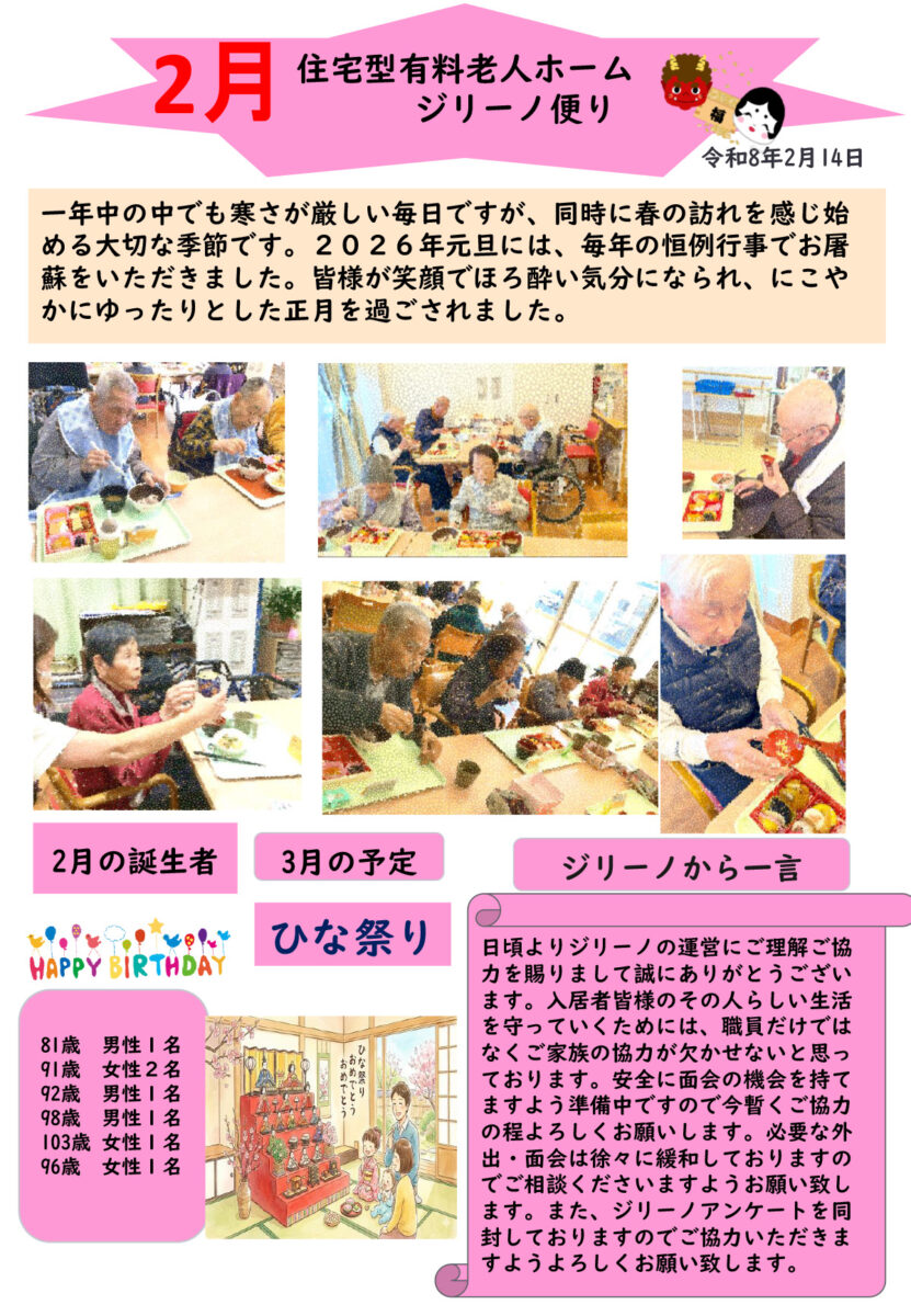 住宅型有料老人ホーム ジリーノ便り2026年2月 2026年02月18日 共有:クリックして Twitter で共有 (新しいウィンドウで開きます)Facebook で共有するにはクリックしてください (新しいウィンドウで開きます)クリックして Google+ で共有 (新しいウィンドウで開きます)